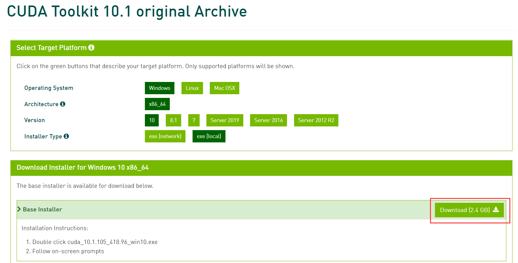 - CUDA 10.1 官网下载链接:https://developer.nvidia.com/cuda-10.1-download-archive-base?target_os=Windows&target_arch=x86_64&target_version=10&target_type=exelocal