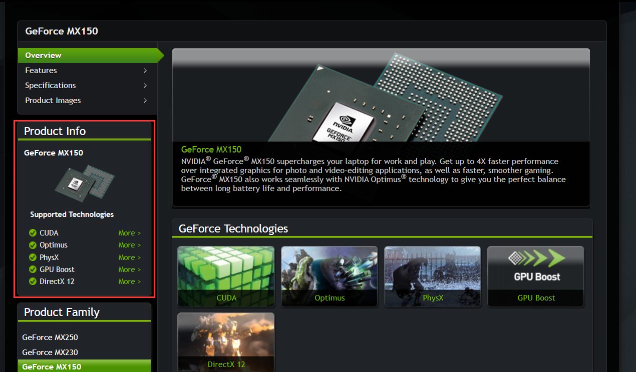 到 NVIDIA 官网查询该型号是否支持 CUDA - 可以看到如下图所示该显卡是支持 CUDA 的,所以可以给 TensorFlow 添加 GPU 支持
