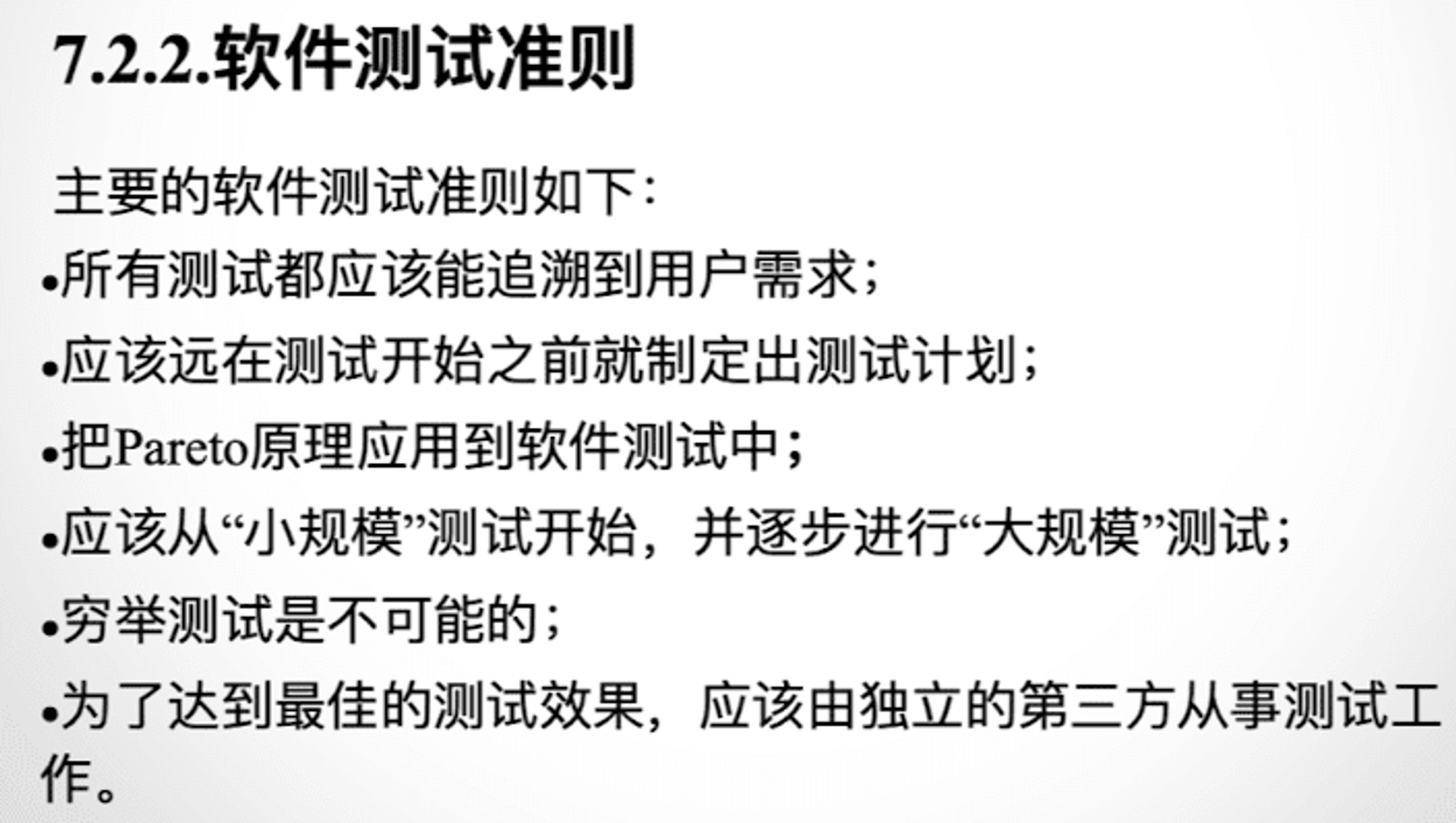 7. **综合测试阶段** :通过各种类型的测试,查出软件设计中的错误并 改正,确保软件质量;还要在用户的参与下进行验收,才可交付使用。