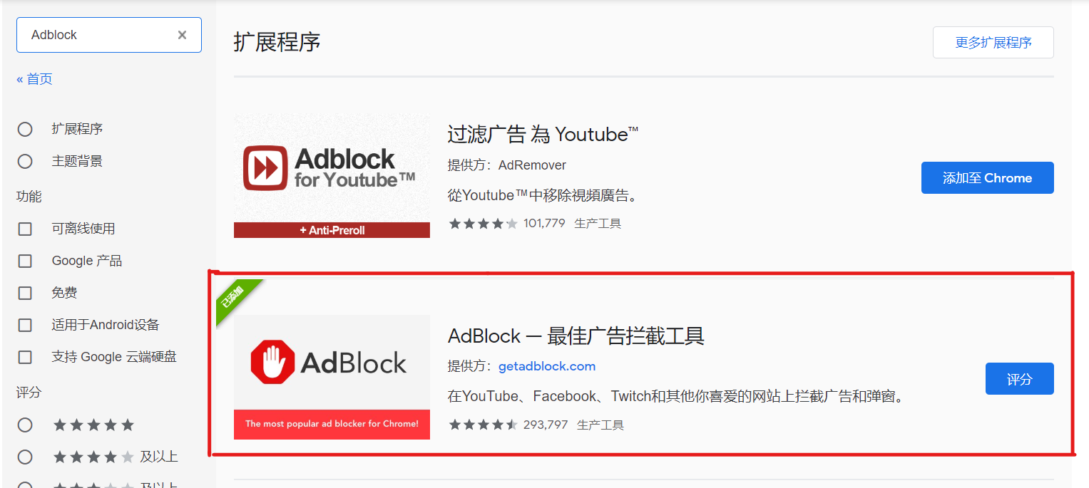——广告拦截神器打开扩展程序,搜索AdBlock
