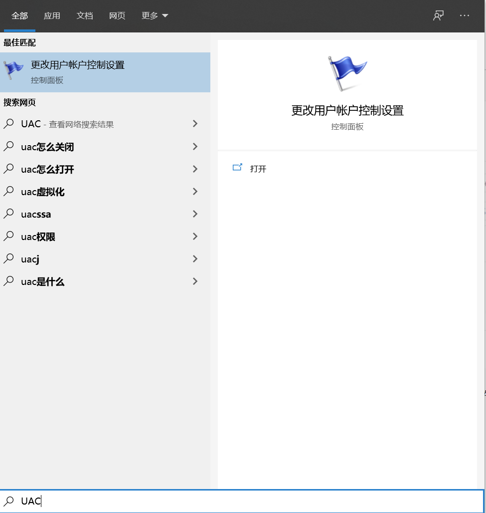 1.在系统搜索框内搜索 UAC,找到后点击打开